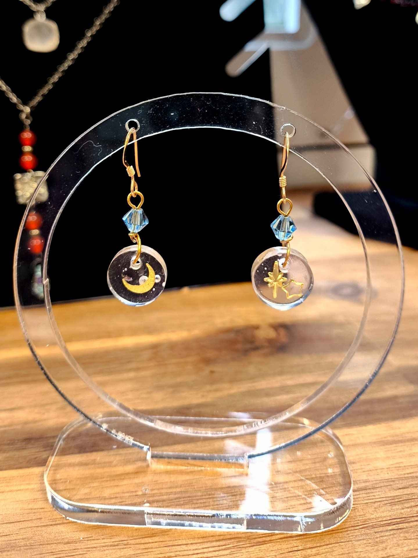 Pendants d'oreilles "Lune étoilée" en résine avec inclusion lune et étoiles dorées ,